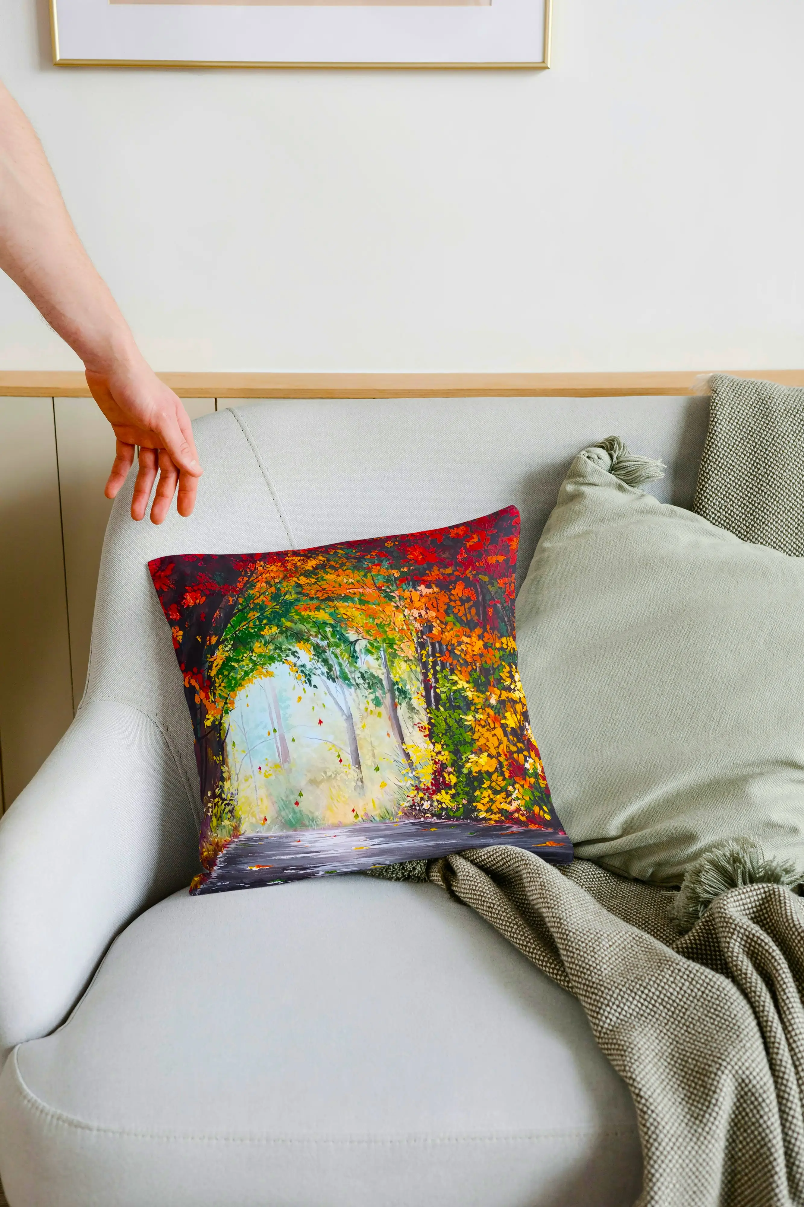 Bring home the beauty of fall with this Pure polyester Cushion Cover featuring the “Autumn Fall” painting by Sonali Shah.